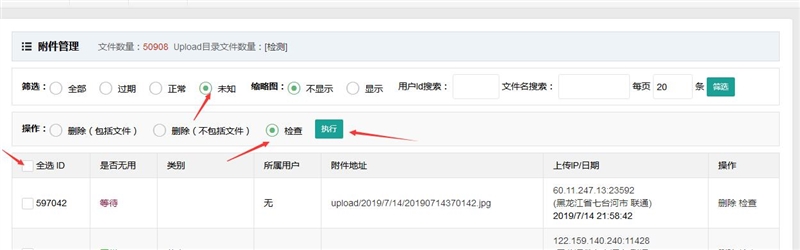 回到附件管理中,筛选未知,全选,检测,执行。就可以检测出图片是否有用了,检测后的图片状态就会变成正常或过期,然后就可以把显示过期的图片删除了