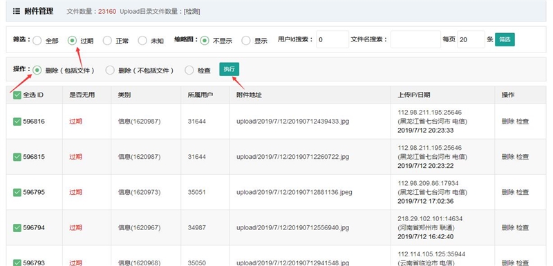 如何删除过期附件方法一、通过上部的筛选,选择过期图片,全选,选择删除(包括文件)点执行就可以了