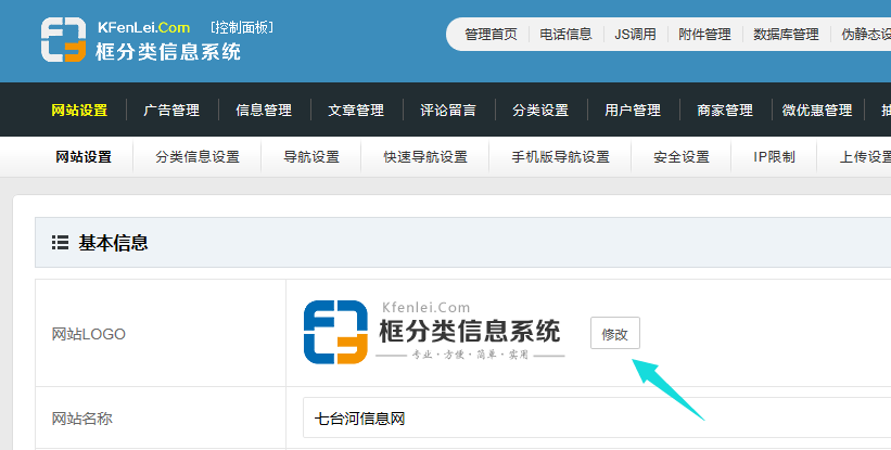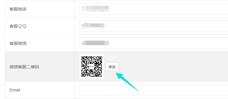 登录后台,在网站设置,可以修改LOGO和微信客服二维码