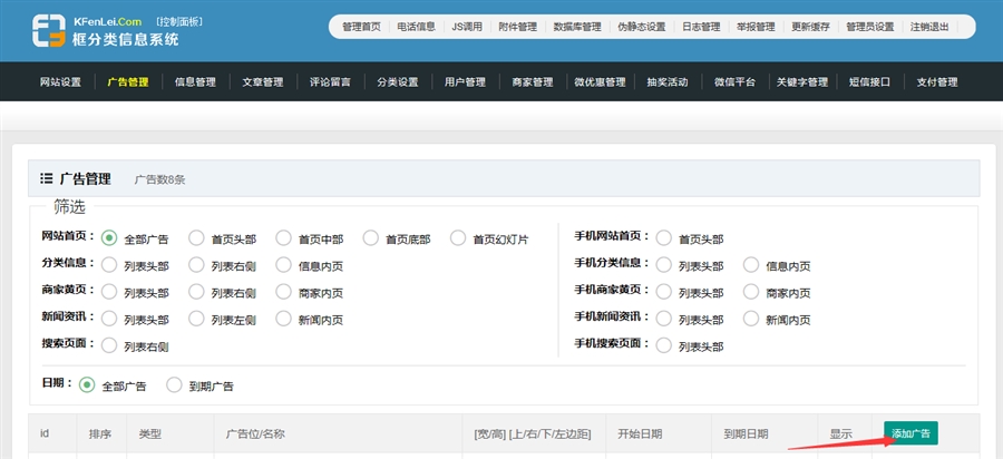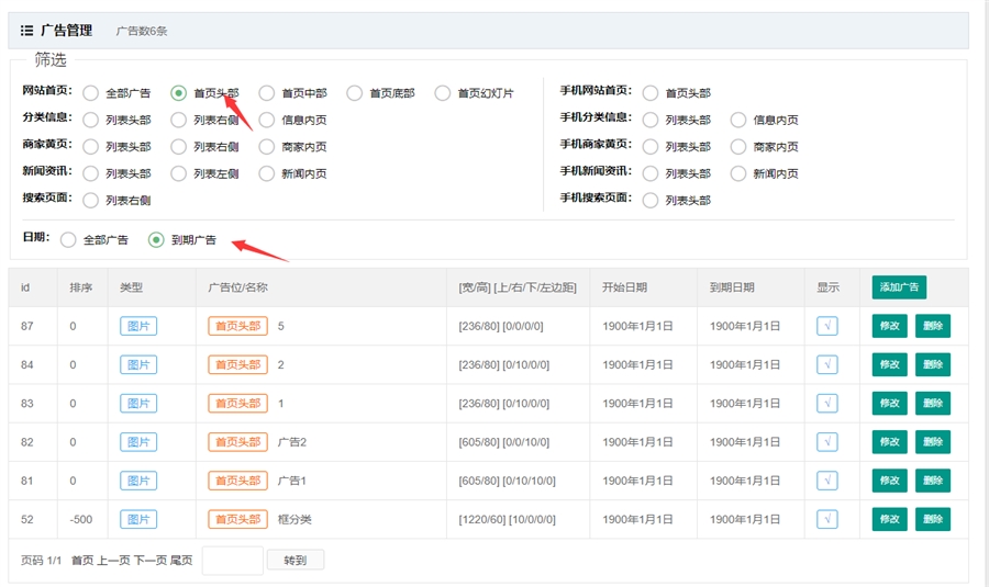 如果设置了广告的开始和结束日期,广告到期后,可以在到期广告中看到,方便站长联系客户续费