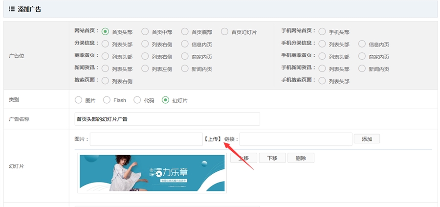 点击添加广告,首页头部的一个图片广告就设置好了
