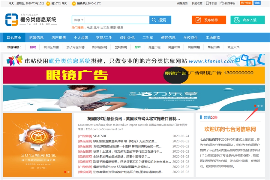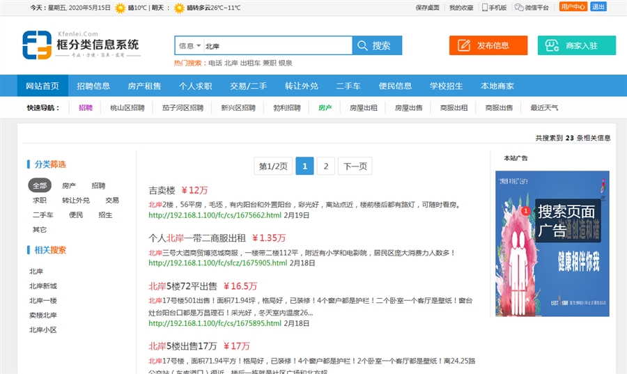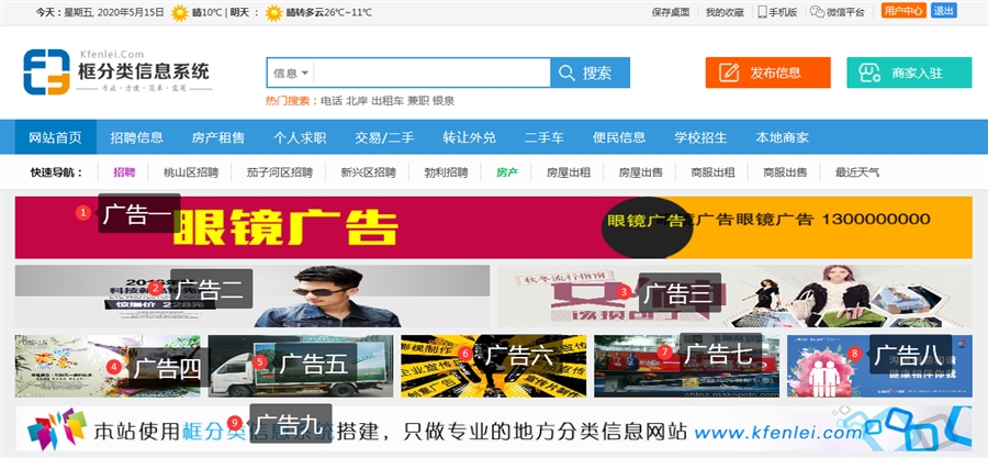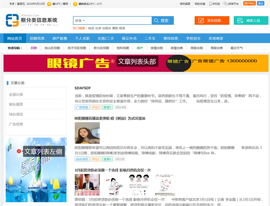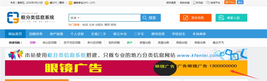 这样填加的广告就会在房产分类中显示了,房产分类设置为独立广告,所以只会显示分类为房产的广告