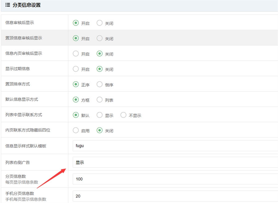 在后台 - 网站设置 - 分类信息设置 列表右则广告设置为显示
