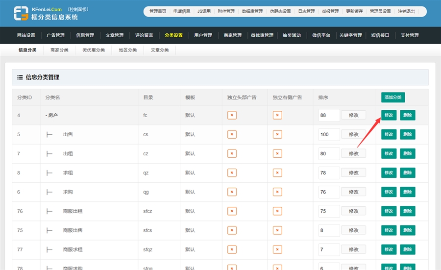 登录后台 - 分类设置,找到房产分类,点击修改