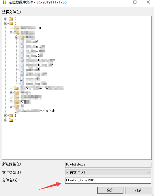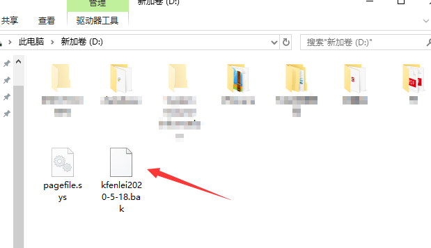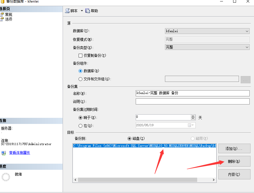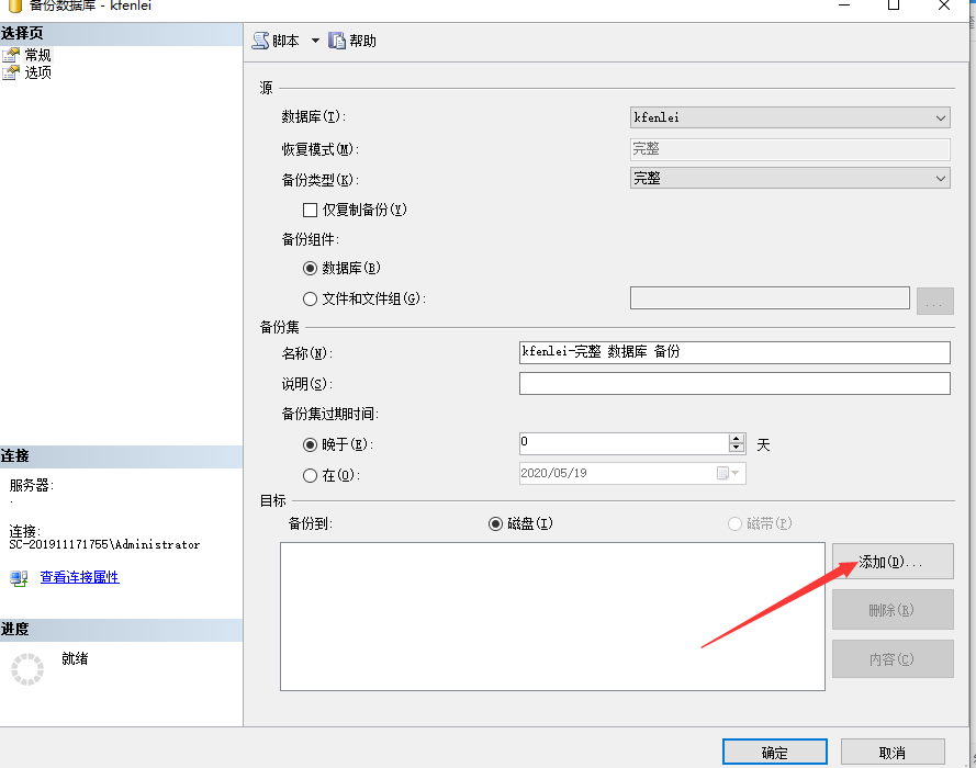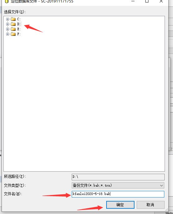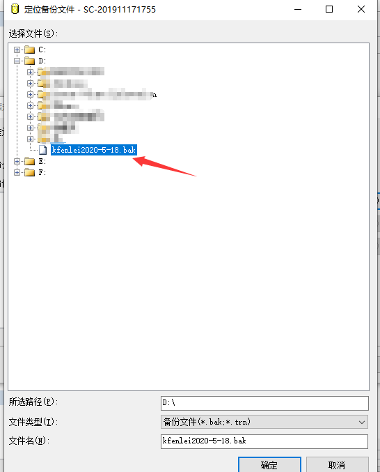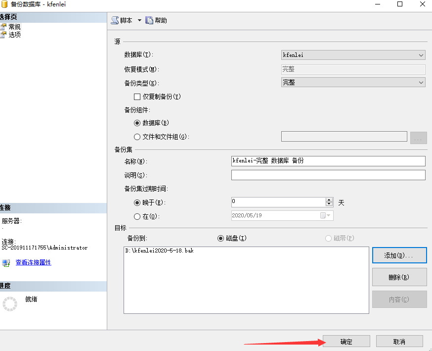 我们这里选择D盘,备份文件名为kfenlei2020-5-18.bak