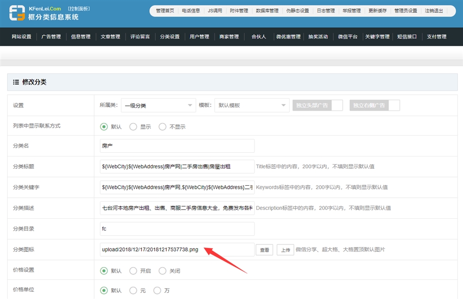 在分类设置中,修改分类,可以设置分类页面分享时显示的图标