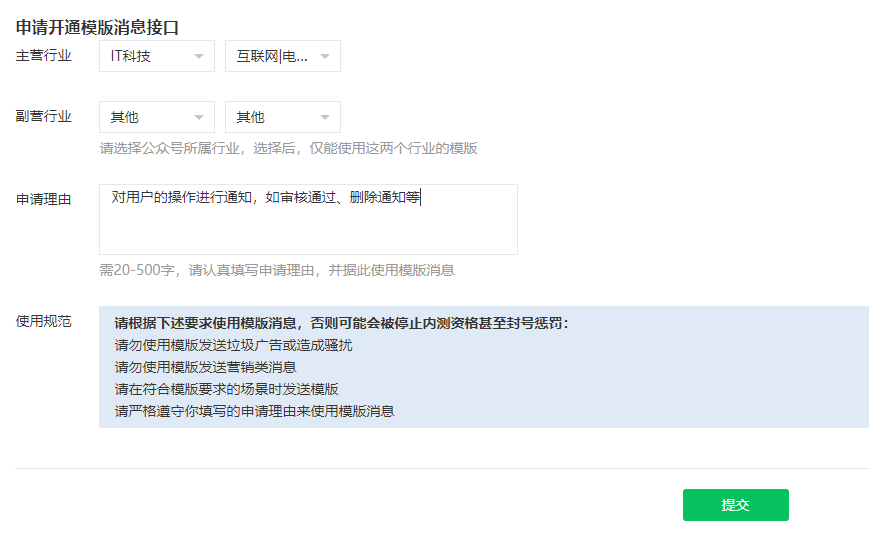 提交申请一般两天内会审核通过,审核通过后就可以使用微信消息模板了