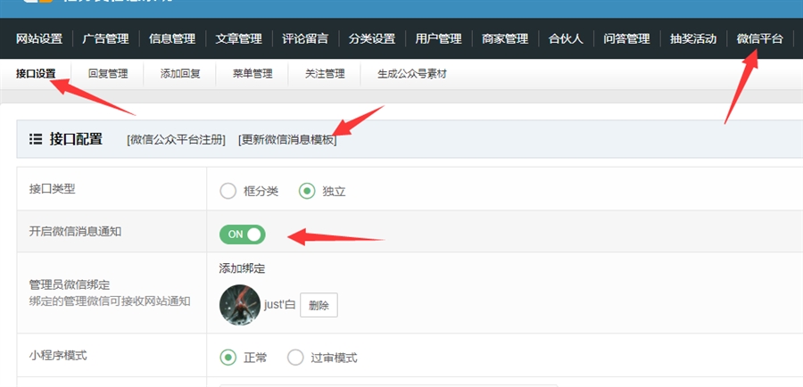 管理员微信绑定,可以绑定管理员微信,接收后台信息审核等通知