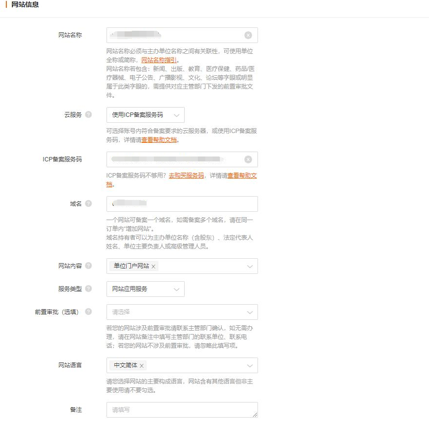 注:资料填写中备案的网站名填您公司的名称,服务类型选择“网站应用服务”,网站内容选择“单位门户网站”