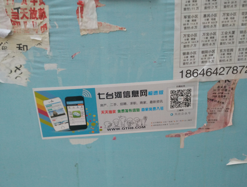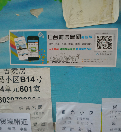 各个小区的公告栏,可以说效果非常好。公告栏本身都是招聘、房产等本地广告,在公告栏看到我们的广告,都会扫一下,打开我们的网站,看看有没有需要的信息或发布一下自己的信息。