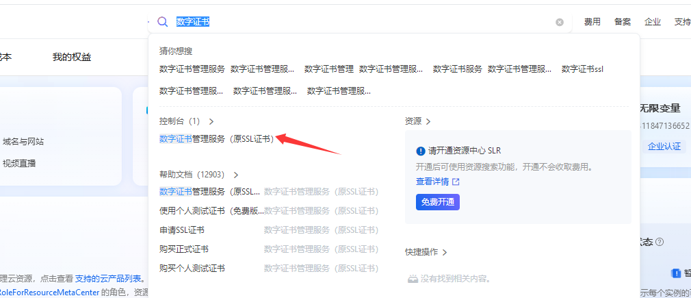 登录阿里云,进入控制台,搜索数字证书,点击数字证书管理服务(原ssl证书)。