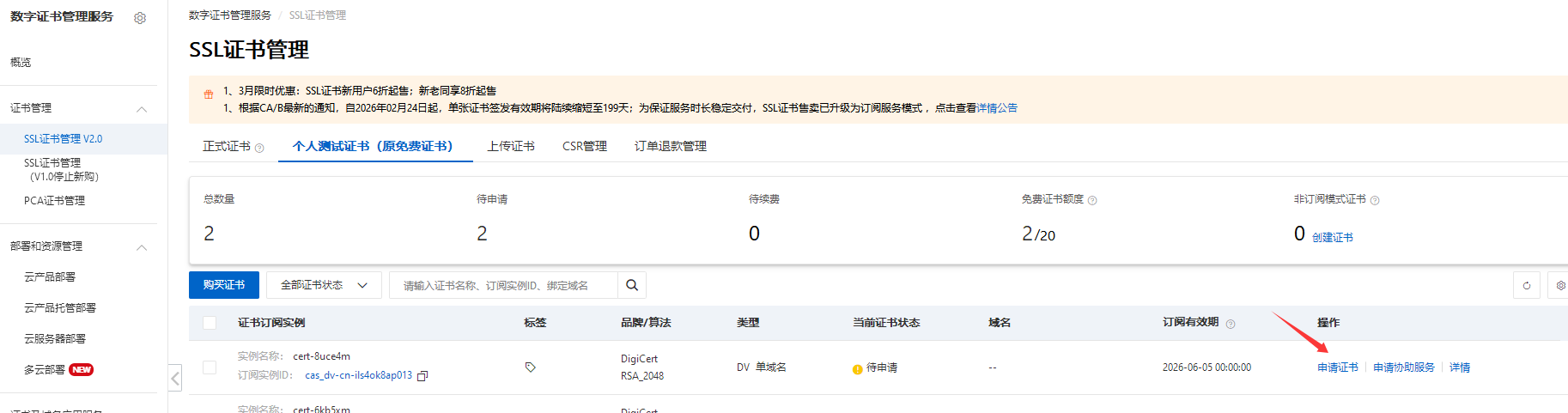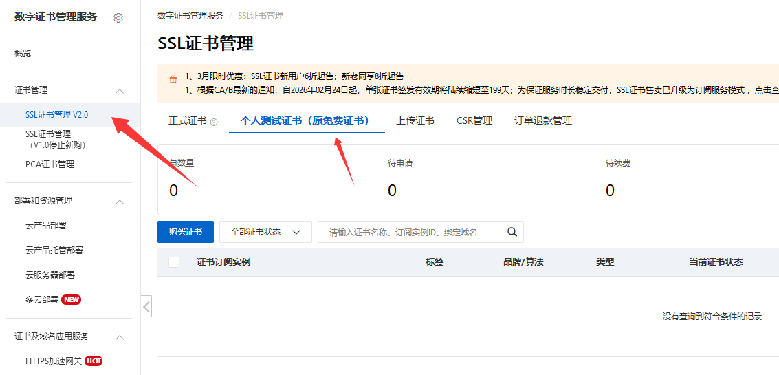 在证书管理 - ssl证书管理v2.0 - 个人测试证书(原免费证书)