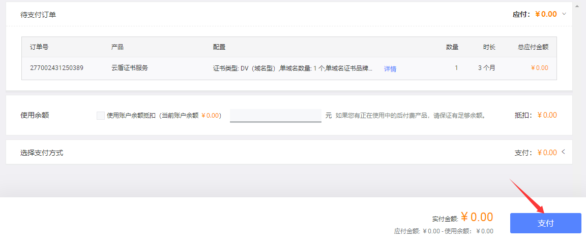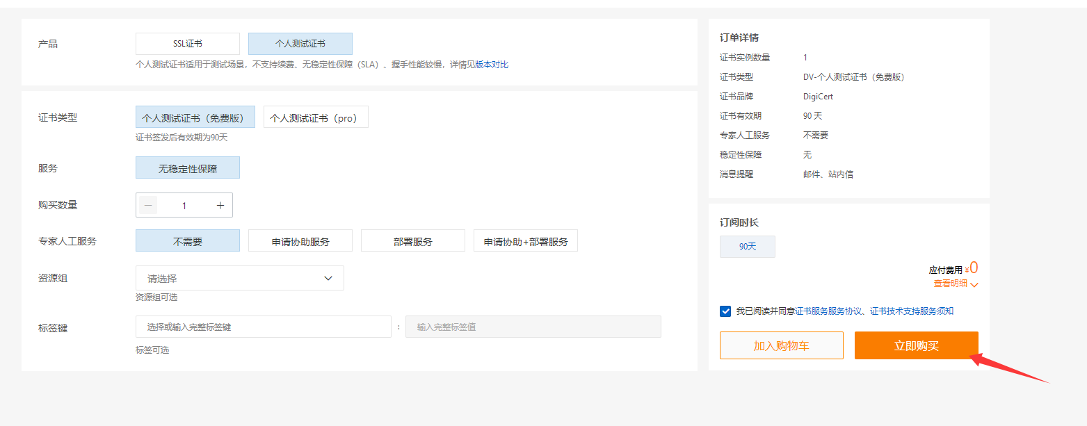点击购买证书,价格0元,每个证书有效期三个月。也就是说每三个月创建一个,每个账号每年可以0元购买20个证书。