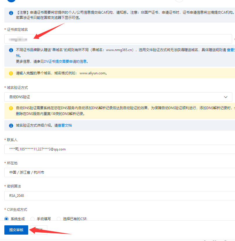 填写好域名和联系人。如果你的域名也在阿里云,验证方式选择“自动”就可以。如果不在阿里云,就选择文件验证或dns验证都可以,根据提示上传验证文件或添加域名解析。