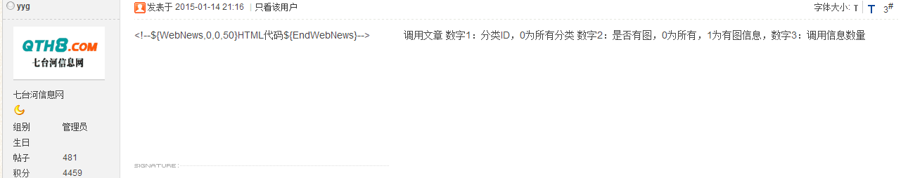 老大发的 <!--${WebNews,0,0,50}HTML代码${EndWebNews}--> 调用文章 数字1:分类ID,0为所有分类 数字2:是否有图,0为所有,1为有图信息,数字3:调用信息数量