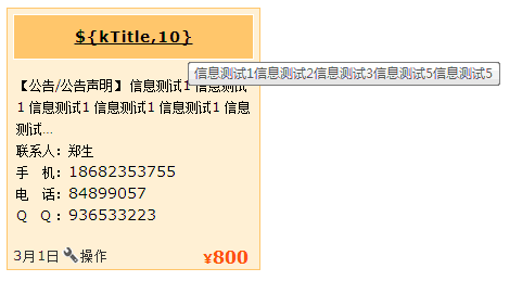 <a title="${kTitle,0}" href="/${kMid}.html" target="_blank">${kTitle,10}</a>加上 title="${kTitle,0}"就成这样如下图