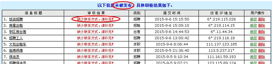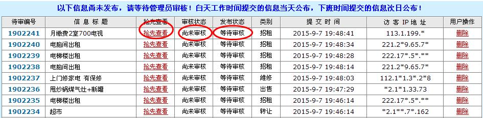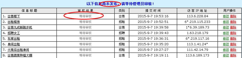 显示待审信息标题。和未被发布信息标题。方便管理查看信息和及时管理发布的信息。以及游客查看发布了没有通过的信息。