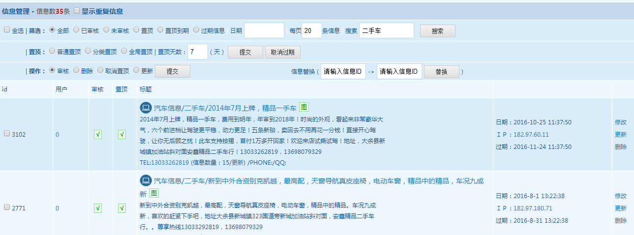我发布的二手车,后台很多条,但是前台类目里只有三条二手车信息,请问总部,这是什么原因呢?是这是问题吗?