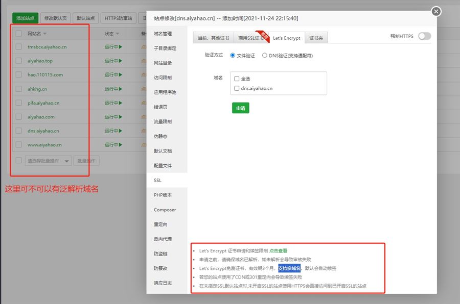 但是站点里面没有绑定泛域名站点不知道能不能支持!